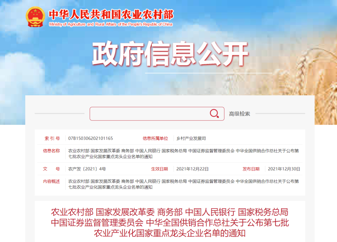 入選第七批農(nóng)業(yè)產(chǎn)業(yè)化國(guó)家重點(diǎn)龍頭企業(yè)