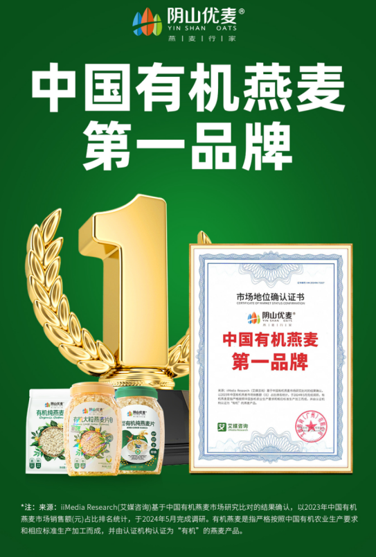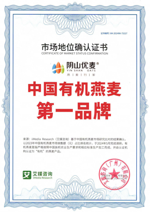 2024年5月,陰山優(yōu)麥獲艾媒咨詢授予的“中國有機(jī)燕麥第一品牌”市場(chǎng)地位認(rèn)證書,此項(xiàng)認(rèn)證,是陰山優(yōu)麥品牌發(fā)展史上的一個(gè)重要里程碑,標(biāo)志著陰山優(yōu)麥在有機(jī)燕麥行業(yè)取得領(lǐng)導(dǎo)地位。