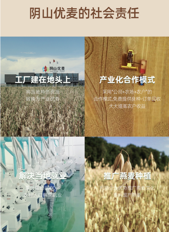 陰山優(yōu)麥在追求企業(yè)發(fā)展的同時(shí),不忘回饋社會(huì),積極參與公益事業(yè),助力鄉(xiāng)村振興。公司通過加強(qiáng)農(nóng)企利益聯(lián)結(jié),把農(nóng)戶納入到燕麥產(chǎn)業(yè)中來,除了加大土地流轉(zhuǎn),讓農(nóng)民取得穩(wěn)定的地租收益,還通過訂單模式,約定燕麥原糧回收保底價(jià)格,幫助農(nóng)民解決“賣難”問題。而且,陰山優(yōu)麥每年還為農(nóng)民捐贈(zèng)燕麥良種、提供技術(shù)培訓(xùn)、增加就業(yè)崗位,幫助農(nóng)民增收致富。在陰山優(yōu)麥的帶動(dòng)下,當(dāng)?shù)剞r(nóng)戶對(duì)種植燕麥的積極性大幅增加,當(dāng)?shù)匮帑湻N植面積和原糧價(jià)格也逐漸提升,進(jìn)一步推動(dòng)了當(dāng)?shù)匮帑湲a(chǎn)業(yè)邁向規(guī)?;?、現(xiàn)代化、產(chǎn)業(yè)化發(fā)展的新臺(tái)階。